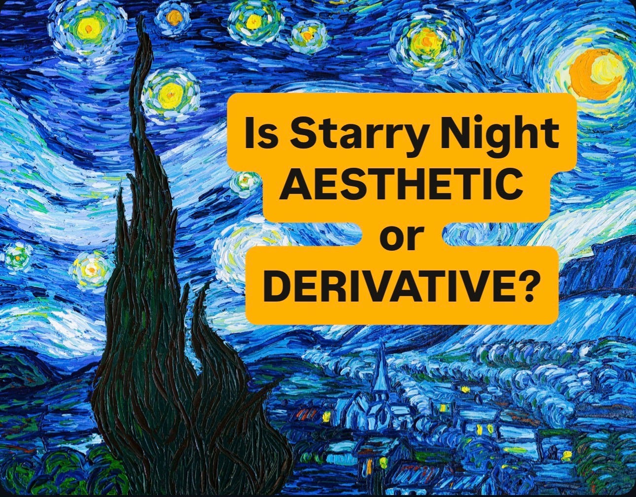 Starry Night is one of the world’s most famous paintings. Is Van Gogh’s masterpiece AESTHETIC or DERIVATIVE? It is definitely visually pleasing and thus an AESTHETIC work of art. It can also be argued that Starry Night is DERIVATIVE because it draws upon Impressionism’s emphasis upon using visible brushstrokes to capture a fleeting moment. It can thus be contended that Starry Night is both AESTHETIC and DERIVATIVE.