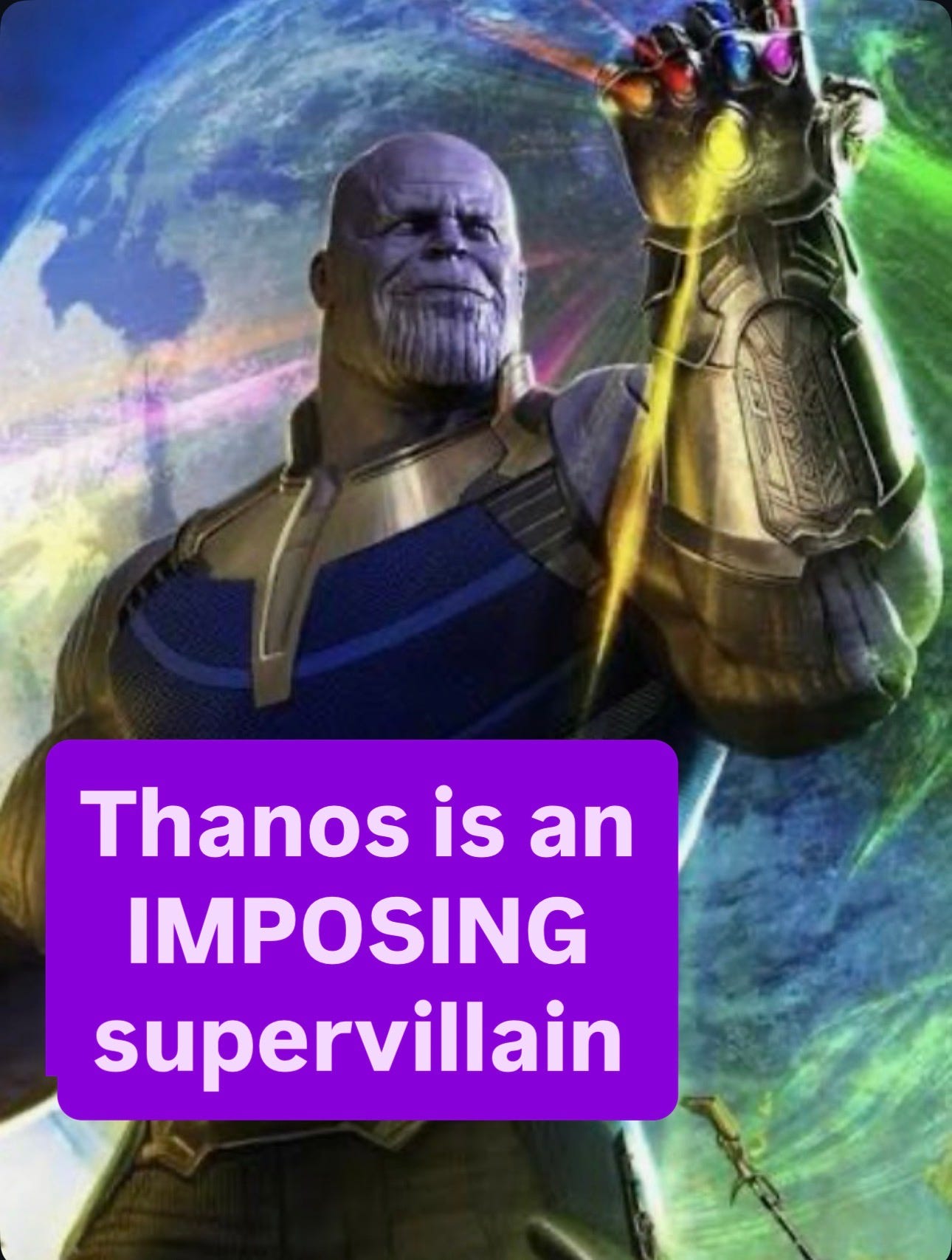 In the Avengers: Endgame, the Avengers must find a way to defeat Thanos. Known as the “Mad Titan,” Thanos presents a particularly IMPOSING physical presence. Standing over 8 feet tall, he towers above his human rivals. His powerful muscles, impenetrable armor, and purple-hued skin contribute to his IMPOSING and fearsome appearance.