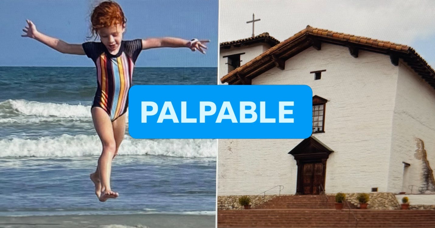 Here’s the surprising answer: Both Kameron and Mission San Jose illustrate the difficult SAT vocabulary word PALPABLE. PALPABLE means visible and thus easily recognized. You know PALPABLE when you see it. Kameron is clearly experiencing a moment of PALPABLE joy as she seems to be walking on sunshine. The architectural features of the Mission San Jose illustrate the PALPABLE influence of Spanish contributions to California architecture.