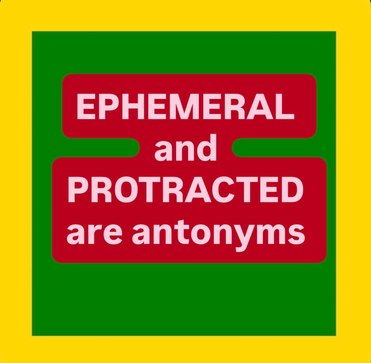 EPHEMERAL and PROTRACTED are antonyms. EPHEMERAL means brief and short-lived. For example, modern clothing and hair styles are deliberately designed to be EPHEMERAL. In contrast, PROTRACTED means prolonged and therefore lasting for a long time. For example, during the early 1930s a PROTRACTED drought in the Great Plains caused widespread crop failures, created massive dust storms, and forced hundreds of thousands of “Okies” to migrate to California.